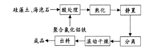 原料海泡石(江西省鄱陽縣) , 硅藻土 (江西省廣昌縣) , 副產物鹽酸(江西電化中達化工有限公司工業副產物鹽酸) , 聚合氯化鋁鐵(江 西省鄱陽縣三清環保節能有限公司產)。