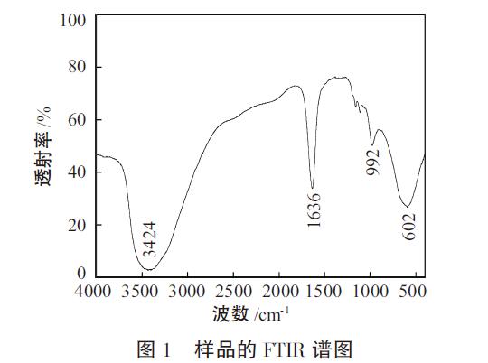 從圖1可以看出,3424cm-1是樣品中與鋁離子相連的-OH基團及樣品內所吸附的水分子和配位分子中的-OH基團伸縮振動產生的。吸收峰面積較大,表明樣品中羥基含量較高。1636cm-1是由結合水(H-O-H)的彎曲振動引起的吸收峰。992cm-1左右的吸收峰是由Fe-OH-Fe,Al-OH-Al的面內伸縮振動峰。602cm-1附近的峰是Al-OH-Al的整體彎曲振動峰。