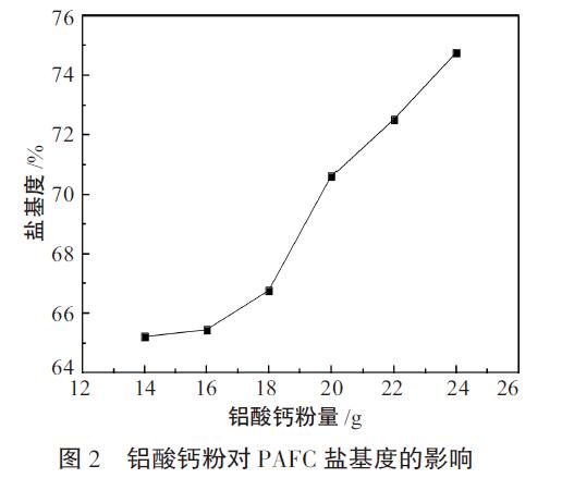 為了考察堿基度對合成聚合氯化鋁鐵絮凝劑的影響,固定12g煤泥灰的酸浸液,其他條件不變,分別添加14、16、18、20、22、24g鋁酸鈣,在聚合溫度為90℃下聚合反應3h,熟化后,測定樣品的堿基度。圖2為鋁酸鈣粉對PAFC鹽基度的影響