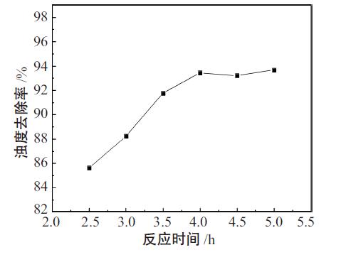 由圖5可以看出,隨著反應時間的延長,濁度去除率逐漸增大,產品的絮凝效果顯著提高,反應時間為4h時,濁度去除率達到較大,再繼續延長反應時間,濁度去除率變化不大。這主要是因為,反應時間過短,反應體系不能吸收足夠的熱量進行水解反應,進而影響聚合反應,導致產品的聚合度不高。隨著反應時間增加,越有利于聚合反應的順利進行,產品的鹽基度增大,濁度去除率上升。反應時間過長,對產品鹽基度增加的貢獻不大,同時浪費大量資源,影響生產周期。較后確定較佳反應時間為4h。