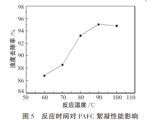 2.2.3反應溫度的影響為了考察反應溫度對合成聚合氯化鋁鐵絮凝劑的影響,固定鋁酸鈣粉量為22g,Al/Fe(摩爾比)至11.4,其它條件不變,在不同的聚合溫度(60℃/70℃/80℃/90℃/100℃)下聚合反應3h,測定產品的絮凝實驗。