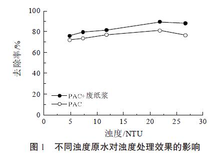 當(dāng)PAC、廢紙漿投加量分別為10、20 mg/L 時, 研究廢紙漿與PAC 配合使用對不同濁度原水的混 凝沉淀處理效果,并與單獨使用投加量10 mg/L PAC 的處理效果相比較,結(jié)果如圖1 所示。